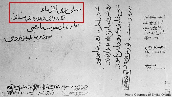سیچی ما توسو تو مورخ معاصر ژاپنی در کتابی بنام پرسپولیس نوشته است" بی تردید در دوران باستان و بیش از هزار سال پیش گونه ای از ارتباطات معنوی و فرهنگی میان ایران و ژاپن از طریق جاده ابریشم برقرار گردیده و فرهنگ و تمدن این دو سرزمین از یکدیگر تاثیر پذیرفته اند در شهر نارا گنجینه ای هست که در آن تعدادی از اشیا که از طریق جاده ابریشم از ایران به ژاپن منتقل شده است وجود دارد معروف است که در سال ۱۲۱۷ م راهبی ژاپنی به نام کیوسی برای آموختن آیین بودایی نزد راهبان چین به آن کشور سفر کرد در جنوب چین با چند بازرگان ایرانی آشنا شد و از آنها خواست چند خط فارسی برایش بنویسند این دستخط هم اکنون در موزه ملی کیوتو میباشد * جهان یادگار است و ما رفتنی