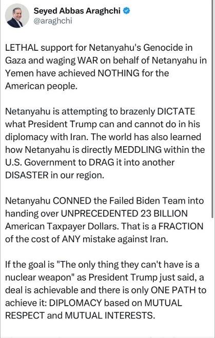 نتانیاهو با وقاحت تلاش می‌کند به رئیس جمهور ترامپ دیکته کند که در دیپلماسی خود با ایران چه کاری می‌تواند انجام دهد و چه کاری نمی‌تواند. جهان همچنین فهمیده که نتانیاهو چگونه مستقیماً در دولت ایالات متحده دخالت می‌کند تا آن را به فاجعه دیگری در منطقه ما بکشاند.