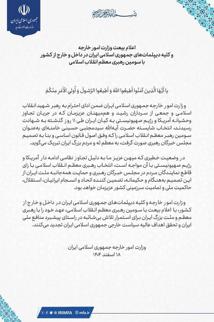 متن اعلام بیعت وزارت امور خارجه و کلیه دیپلمات‌های جمهوری اسلامی ایران در داخل و خارج از کشور با سومین رهبر معظم انقلاب اسلامی را ذیلا ملاحظه فرمایید.